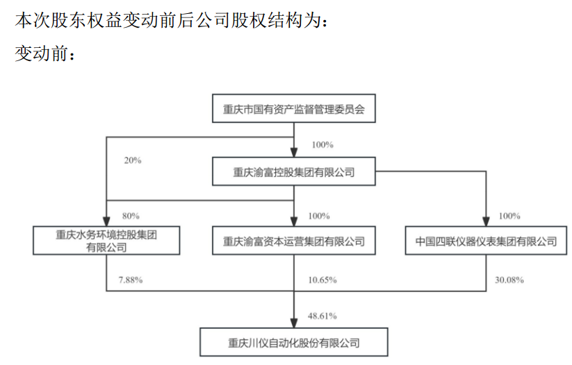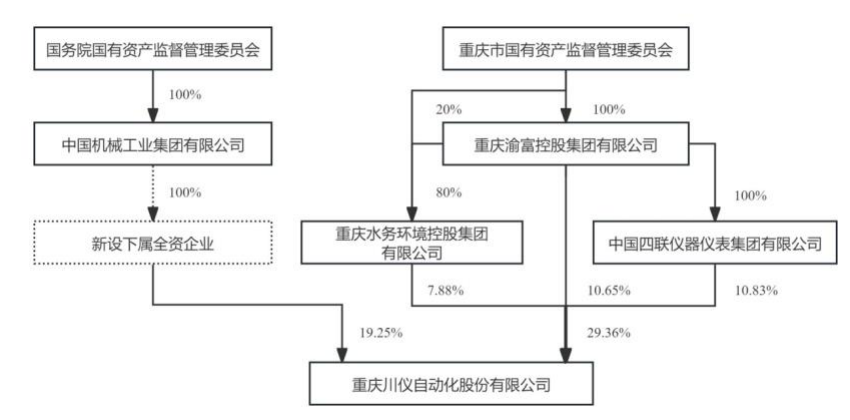 上述交易完成前,重慶市國資委合計(jì)掌控川儀股份48.61%的股份比例。上述交易完成后,重慶市國資委合計(jì)掌控川儀股份29.36%的股份比例,國機(jī)集團(tuán)或其新設(shè)全資企業(yè)將持有川儀股份19.25%的股份比例。