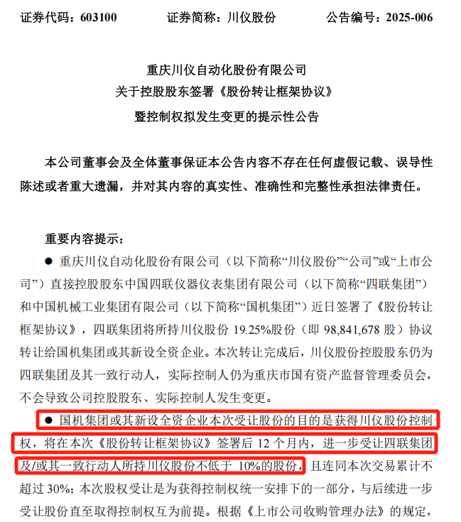 公告顯示,1月13日,四聯(lián)集團(tuán)與國機(jī)集團(tuán)簽署《股份轉(zhuǎn)讓框架協(xié)議》,約定由國機(jī)集團(tuán)或其新設(shè)全資企業(yè),協(xié)議受讓四聯(lián)集團(tuán)所持川儀股份9884.17萬股股份,占川儀股份總股本的比例為19.25%。