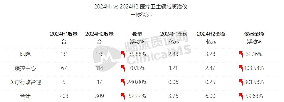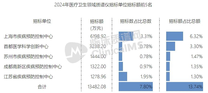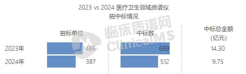 臨床質譜網根據公開招投標數據統計,2024年醫療衛生領域通過招投標采購質譜儀器約500余臺,中標總金額近10億,通過招投標發布采購需求的單位有近400家。