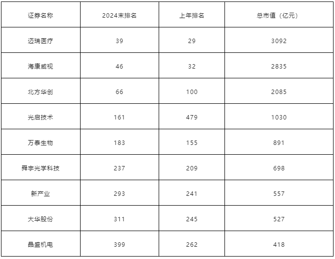 2024年股市圓滿收官,中國上市公司市值500強榜單隨之揭曉。數據顯示,2024年市值500強企業平均市值、中位數市值和最低市值分別為1483億元、651億元和344億元,較2023年分別增長241億元、60億元和36億元。 經小編統計,多家儀器企業登榜,涵蓋邁瑞醫療(生命科學儀器領域)、??低暎ü鈱W儀器領域)及北方華創(半導體設備供應商)等,展現了其在各自專業領域的卓越成就。