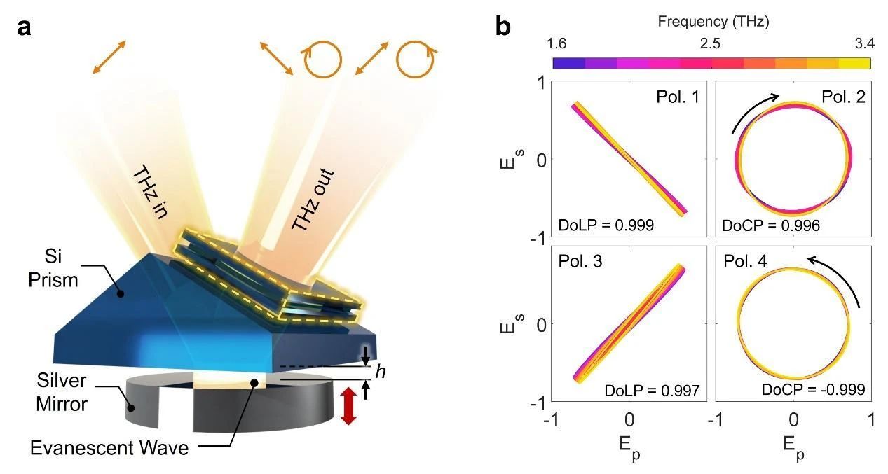在這項研究中,科研人員新研發(fā)的太赫茲波偏振調(diào)制器,可以靈活控制太赫茲波偏振,輸出任意的偏振態(tài)。“相比已報道的其他太赫茲波偏振調(diào)制器,我們研發(fā)的偏振調(diào)制器在多功能性、大工作帶寬以及高控制精度方面取得顯著突破,可為光譜檢測提供先進的偏振解析能力,能滿足材料物理特性研究、生物制藥品質(zhì)監(jiān)測等應用需求,也可作為下一代信息技術(shù)的核心部件,在高速通信中降低傳輸損耗、提高數(shù)據(jù)吞吐量。”陳學權(quán)說。