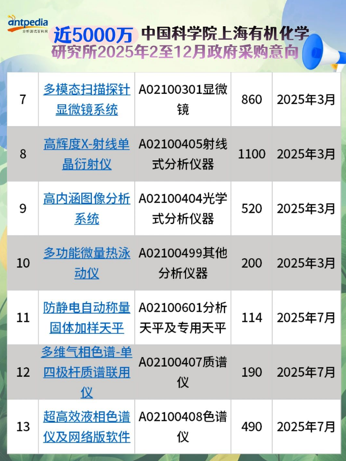 中國科學(xué)院上海有機(jī)化學(xué)研究所2025年2至12月政府采購意向發(fā)布,預(yù)算金額4895萬,采購項目13個。