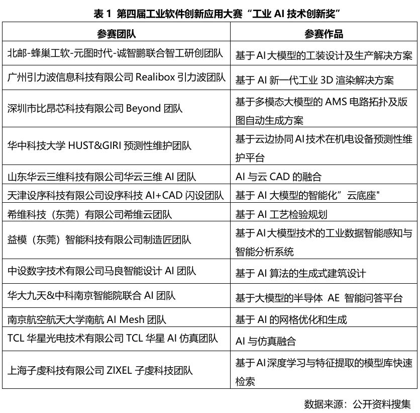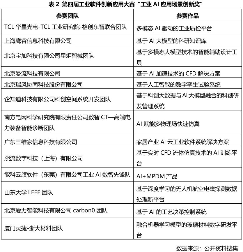 第四屆工業軟件創新應用大賽以“AI+工業軟件為主題,涌現出一大批優秀的AI創新與應用項目,有98家隊伍參與比賽,有41支隊伍入圍決賽,13支隊伍獲得技術創新獎,13支隊伍獲得應用場景創新獎。