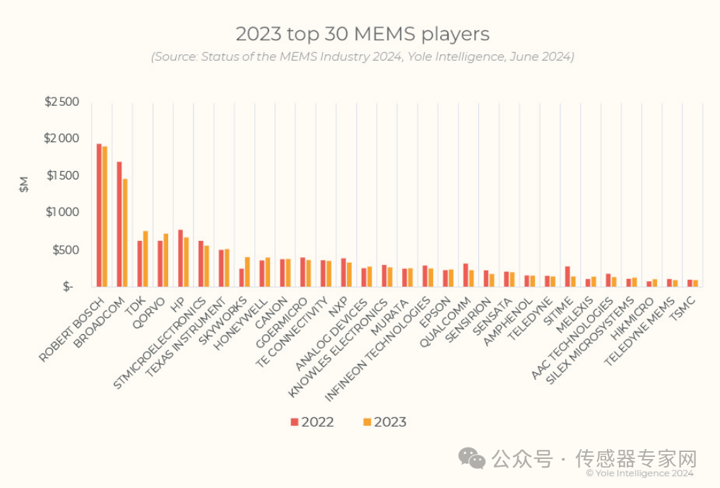 從全球MEMS廠商TOP 30名單來看,來自美國的廠商有Broadcom(博通)、QorvoHewlett Packard(惠普)、Texas Instruments(德州儀器)、SkyworksHoneywell(霍尼韋爾)、Analog DevicesADI)、Knowles Electronics(樓氏電子)、Qualcomm(高通)、Sensata(森薩塔)、Amphenol(安費諾)、Teledyne(FLIR,MEMS)Si Time等,占據榜單的近一半。