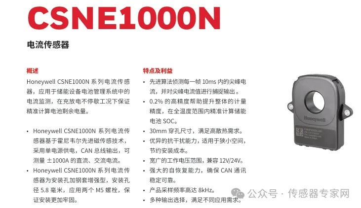 霍尼韋爾推出的CSNE 1000系列電流傳感器即在中國南京研發完成和生產,CSNE 1000系列電流傳感器是一款針對儲能等應用場景研發的高性能傳感器產品,已在全球多家儲能巨頭公司產品中應用。