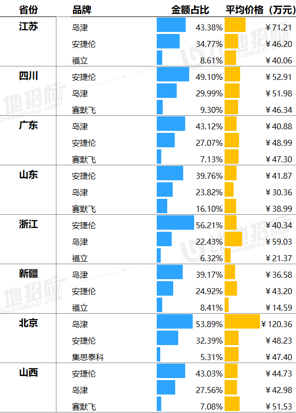價格方面,海南、北京、貴州平均金額相對較高,平均單價分別為63.14萬元、56.91萬元、54.83萬元;寧夏、湖北、西藏平均金額相對較低,平均單價分別為28.72萬元、27.38萬元、20.59萬元。