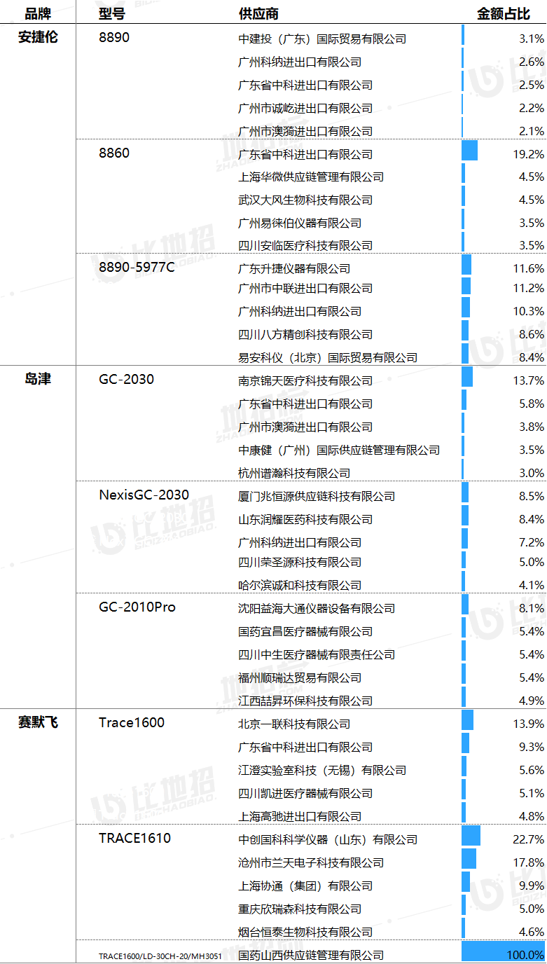 主要供應商及對應中標品牌包括:中建投(廣東)國際貿易有限公司(安捷倫),南京錦天醫療科技有限公司(島津),北京一聯科技有限公司(賽默飛)等。
