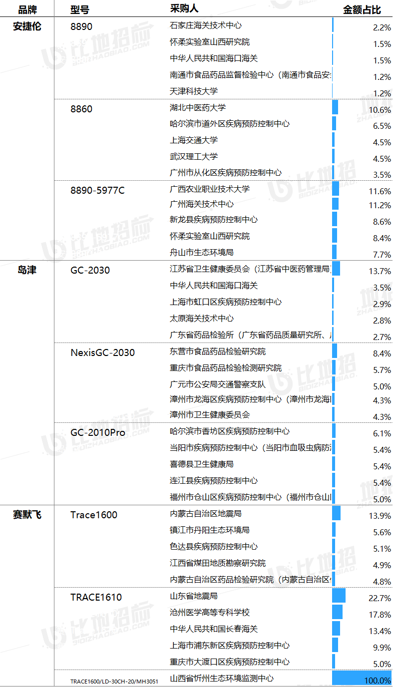 主要采購單位及對應中標品牌包括:石家莊海關技術中心(安捷倫),江蘇省衛生健康委員會(江蘇省中醫藥管理局)(島津),內蒙古自治區地震局(賽默飛)等。