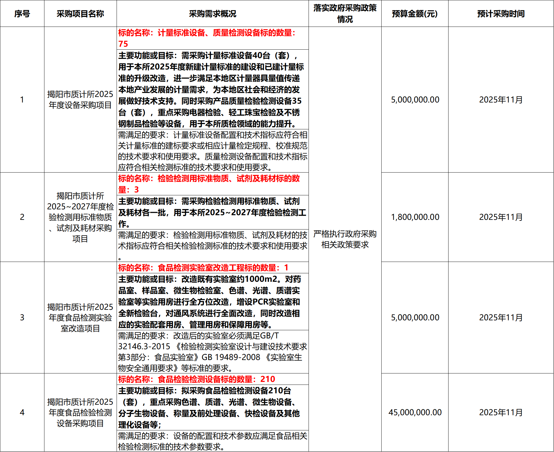 4 22 日,廣東省揭陽市質量計量監督檢測所就 2025 04 月至 2025 11 月政府采購意向連續發布 4 個公告。公告顯示,在 11 月份,揭陽質量計量監督所將著重采購色譜、質譜、光譜、微生物設備、分子生物設備、稱量及前處理設備、快檢設備及其他理化設備等 210 臺儀器用于食品檢驗檢測;采購相關檢驗檢測用標準物質、試劑及耗材 3 批;采購計量標準設備 40 臺(套);采購產品質量檢驗檢測設備 35 臺(套)。