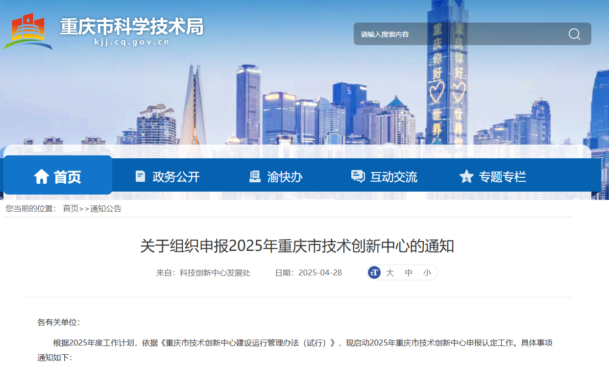 根據(jù)2025年度工作計劃,依據(jù)《重慶市技術(shù)創(chuàng)新中心建設(shè)運行管理辦法(試行)》,現(xiàn)啟動2025年重慶市技術(shù)創(chuàng)新中心申報認(rèn)定工作。具體事項通知如下: