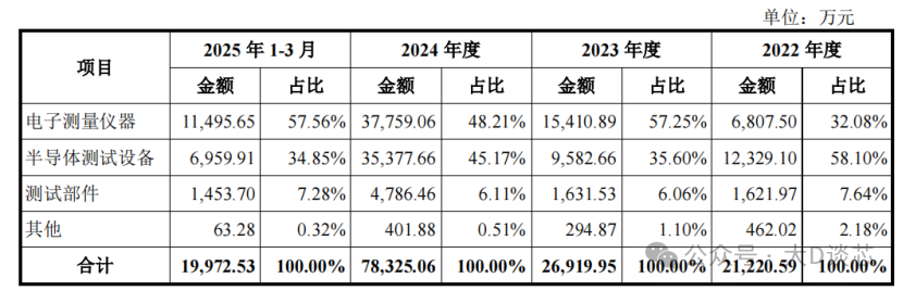 公司產(chǎn)品主要包括電子測量儀器和半導體測試設(shè)備,以及配套的測試部件及服務(wù)。2025年1-3月電子測量儀器的營業(yè)收入金額為11495.65萬元,占比57.56%;半導體測試設(shè)備的營業(yè)收入為6959.91萬元,占比34.85%。