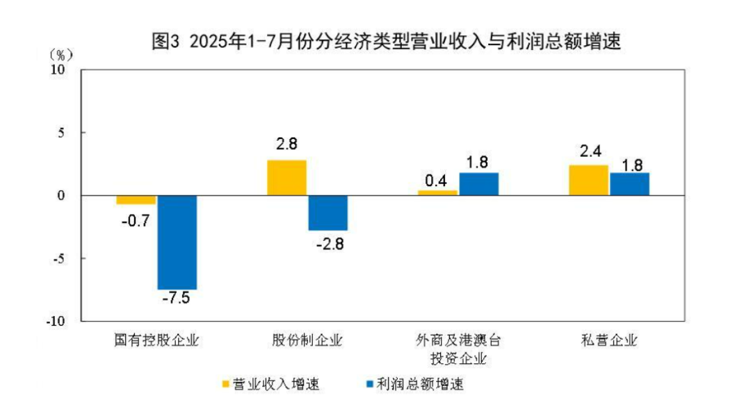 1—7月份,規(guī)模以上工業(yè)企業(yè)中,國有控股企業(yè)實(shí)現(xiàn)利潤總額12823.4億元,同比下降7.5%;股份制企業(yè)實(shí)現(xiàn)利潤總額29742.5億元,下降2.8%;外商及港澳臺投資企業(yè)實(shí)現(xiàn)利潤總額10216.7億元,增長1.8%;私營企業(yè)實(shí)現(xiàn)利潤總額11183.7億元,增長1.8%。1—7月份,采礦業(yè)實(shí)現(xiàn)利潤總額4930.9億元,同比下降31.6%;制造業(yè)實(shí)現(xiàn)利潤總額30235.8億元,增長4.8%;電力、熱力、燃?xì)饧八a(chǎn)和供應(yīng)業(yè)實(shí)現(xiàn)利潤總額5036.8億元,增長3.9%。
