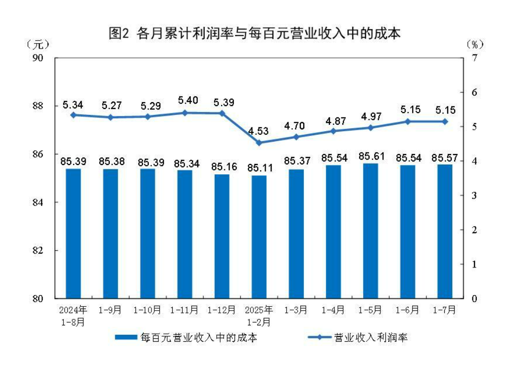 1—7月份,規(guī)模以上工業(yè)企業(yè)實(shí)現(xiàn)營業(yè)收入78.07萬億元,同比增長2.3%;發(fā)生營業(yè)成本66.80萬億元,增長2.5%;營業(yè)收入利潤率為5.15%,同比下降0.21個(gè)百分點(diǎn)。