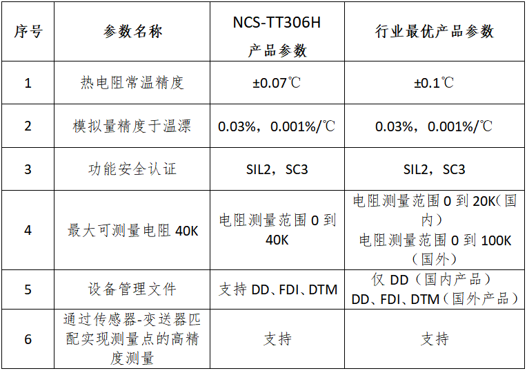 NCS-TT306H采用數(shù)字化技術,內(nèi)置24bit高性能ADC,實現(xiàn)高可靠性、高測量精度和高長期穩(wěn)定性,滿足各種工業(yè)現(xiàn)場的測溫需求。真正雙通道設計,6端子的傳感器設計可滿足不同的雙輸入組合,可用于對冗余有要求的關鍵應用場合。符合IEC 61508功能安全標準的全面評估,安全等級達到了SIL2、SC3的要求。