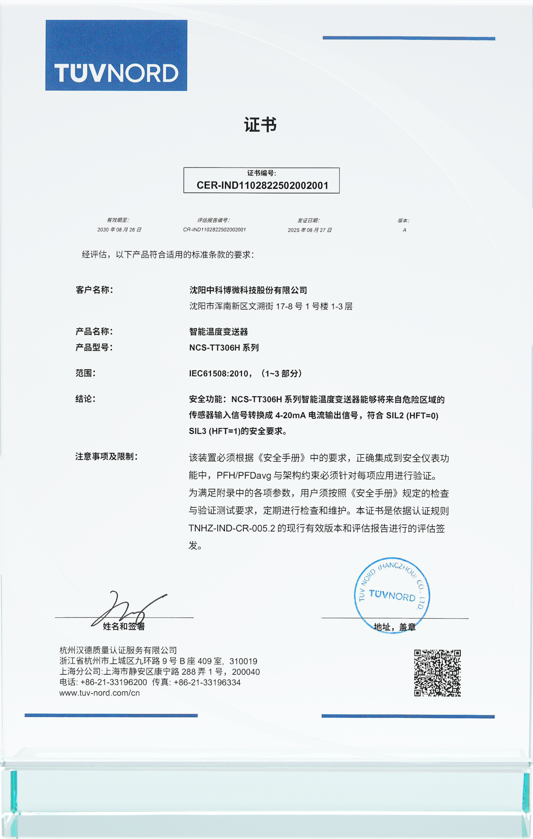 沈陽中科博微科技股份有限公司自主研發的NCS-TT306H智能溫度變送器通過TÜV測試,獲得功能安全SIL認證權威證書,安全等級達到SIL2、SC3的要求。