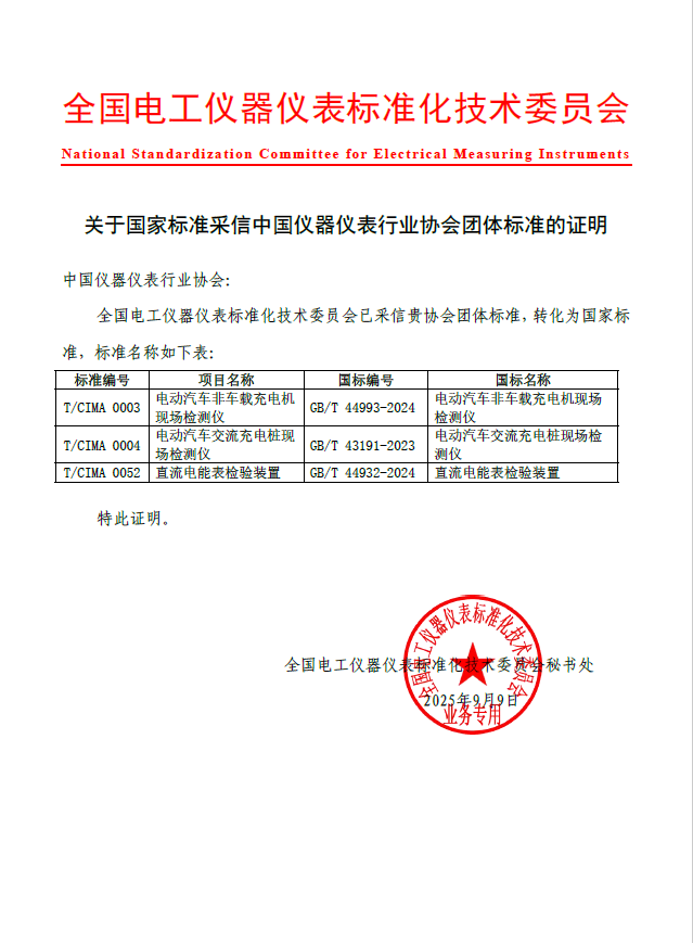 9月,全國電工儀器儀表標準化技術委員會給協會發來證明文件,協會的3項團體標準已被國標委采信,正式轉化為國家標準。