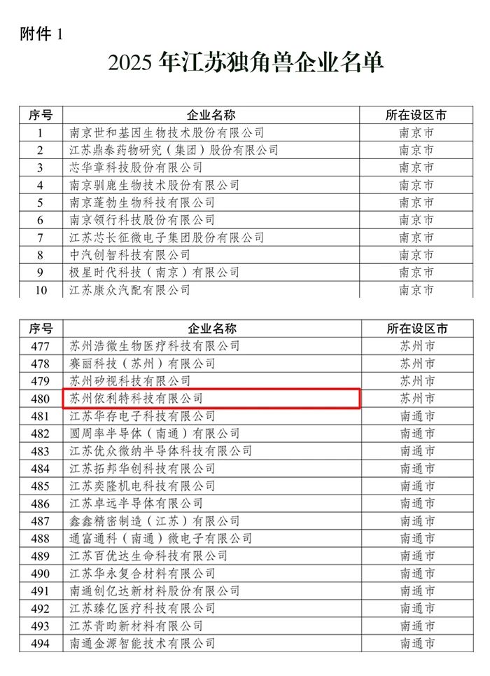 近日,江蘇省新質(zhì)生產(chǎn)力促進(jìn)中心正式發(fā)布《關(guān)于發(fā)布 2025 年江蘇獨(dú)角獸企業(yè)評(píng)估結(jié)果的通知》,經(jīng)過嚴(yán)格遴選與專業(yè)評(píng)估,蘇州依利特科技有限公司憑借在技術(shù)創(chuàng)新、產(chǎn)業(yè)潛力與高質(zhì)量發(fā)展貢獻(xiàn)方面的突出表現(xiàn),成功榮登 2025 年江蘇獨(dú)角獸企業(yè)名單,成為江蘇省高成長企業(yè)群體中的代表之一。