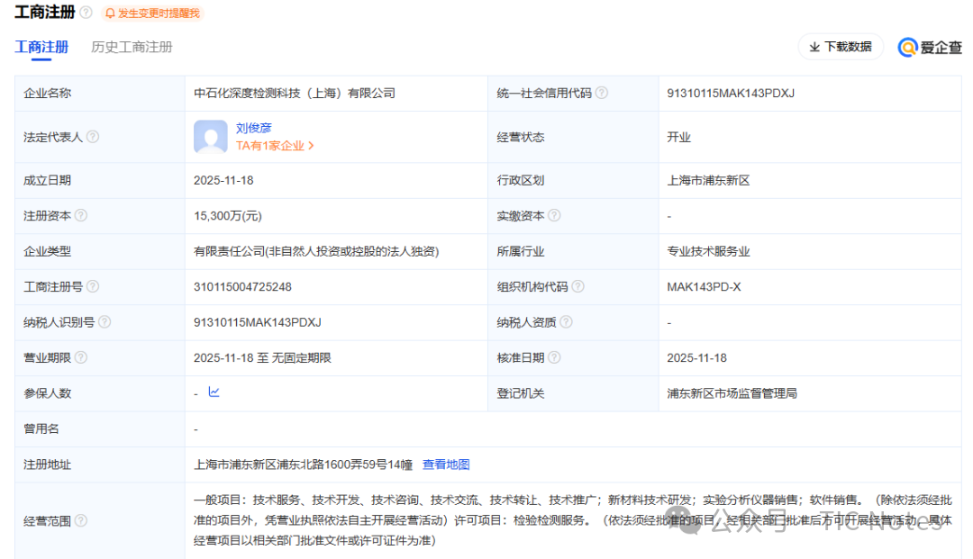 2025年11月18日,中石化深度檢測科技 (上海) 有限公司正式成立,注冊資金1.53 億,由中石化全資持股,經(jīng)營范圍明確包含實驗分析儀器銷售、檢驗檢測服務(wù)。