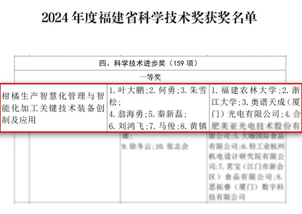 近日,奧譜天成憑借《基于高光譜多譜融合技術(shù)的柑橘生長全周期與品質(zhì)檢測系統(tǒng)》榮獲福建省科技進(jìn)步一等獎。該獎項由福建省人民政府設(shè)立,是省內(nèi)最高級別的科技榮譽之一,重點表彰在技術(shù)創(chuàng)新、工程應(yīng)用及行業(yè)貢獻(xiàn)方面取得突出成果的單位。本次獲獎不僅體現(xiàn)了該項目在關(guān)鍵技術(shù)上的創(chuàng)新突破,也標(biāo)志著奧譜天成在農(nóng)業(yè)智能檢測裝備領(lǐng)域的領(lǐng)先實力得到權(quán)威認(rèn)可。