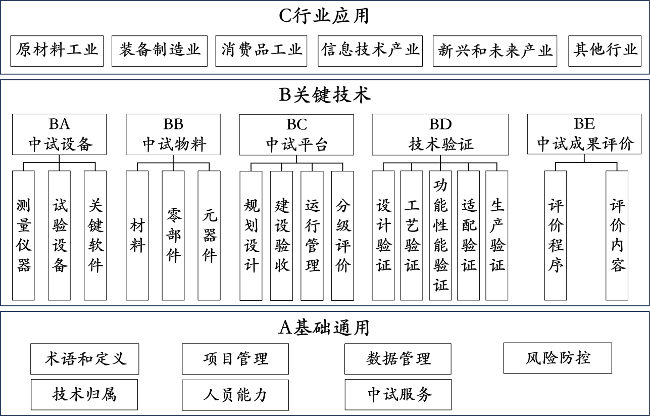 制造業中試標準體系結構包括基礎通用、關鍵技術、行業應用等3個部分,如圖1所示。其中,基礎通用標準規范制造業中試的通用性技術和要求,是制造業中試標準體系的底層支撐。關鍵技術標準規范制造業中試設備、物料、平臺、驗證、成果評價等要求,是制造業中試標準體系的核心內容。行業應用標準規范各行業中試的應用要求,確保中試活動在具體行業規范科學開展,是制造業中試標準體系的應用拓展。