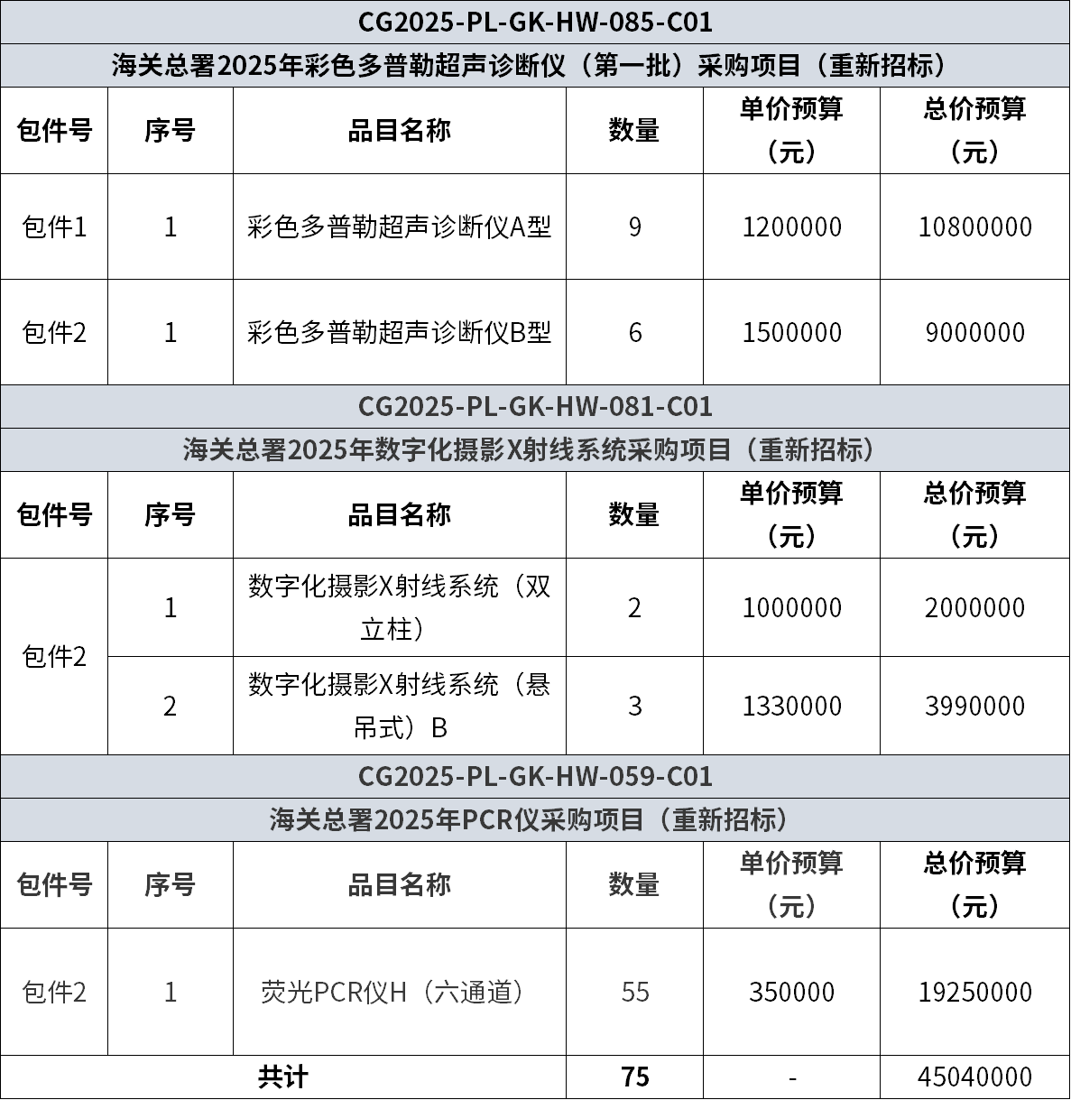 公告明確,此次重新招標(biāo)覆蓋數(shù)字化攝影X射線系統(tǒng)、熒光PCR儀、彩色多普勒超聲診斷儀等儀器設(shè)備。共計(jì)75臺(tái)套設(shè)備、總預(yù)算4504萬元。
