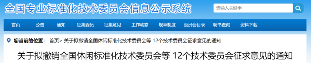日前,《關于擬撤銷全國休閑標準化技術委員會等12個技術委員會征求意見的通知》正式發布。具體內容如下: