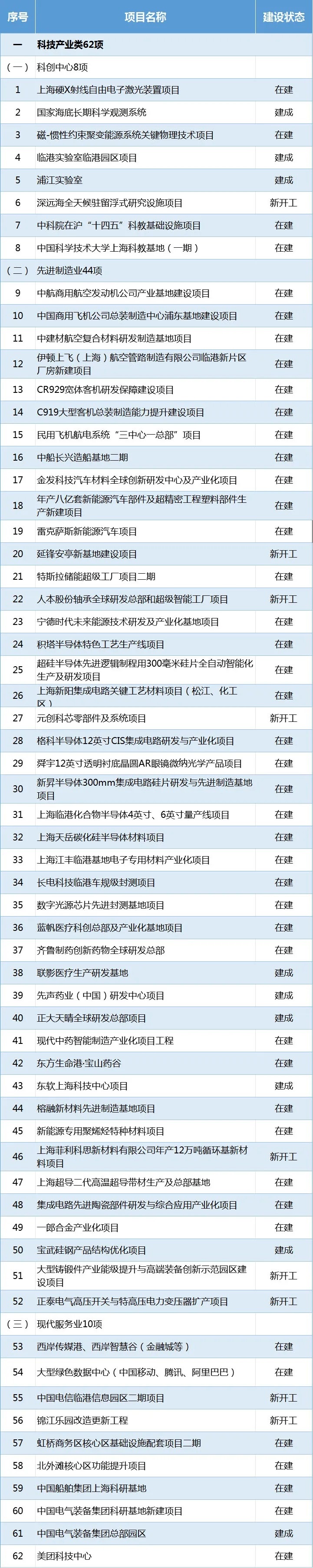 在建項目61項:上海LNG站線擴建、漕涇綜合能源中心二期、浦東機場四期擴建及配套工程、東方樞紐上海東站及配套工程、市域線嘉閔線及北延伸、漕寶路快速路、龍水南路越江隧道等。