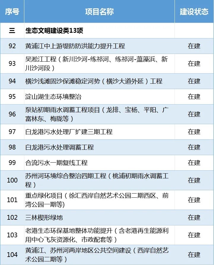 在建項目13項:黃浦江中上游堤防防洪能力提升工程、吳淞江工程(新川沙河-練祁河、練祁河-蕰藻浜、新川沙河段)、淀山湖生態環境整治等。