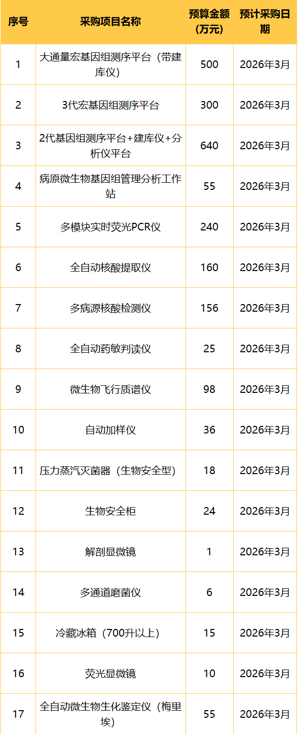 為便于供應商及時了解政府采購信息,根據《財政部關于開展政府采購意向公開工作的通知》(財庫〔2020〕10號)等有關規定,現將“十五五“儀器設備項目2026年2月至12月政府采購意向公開如下: