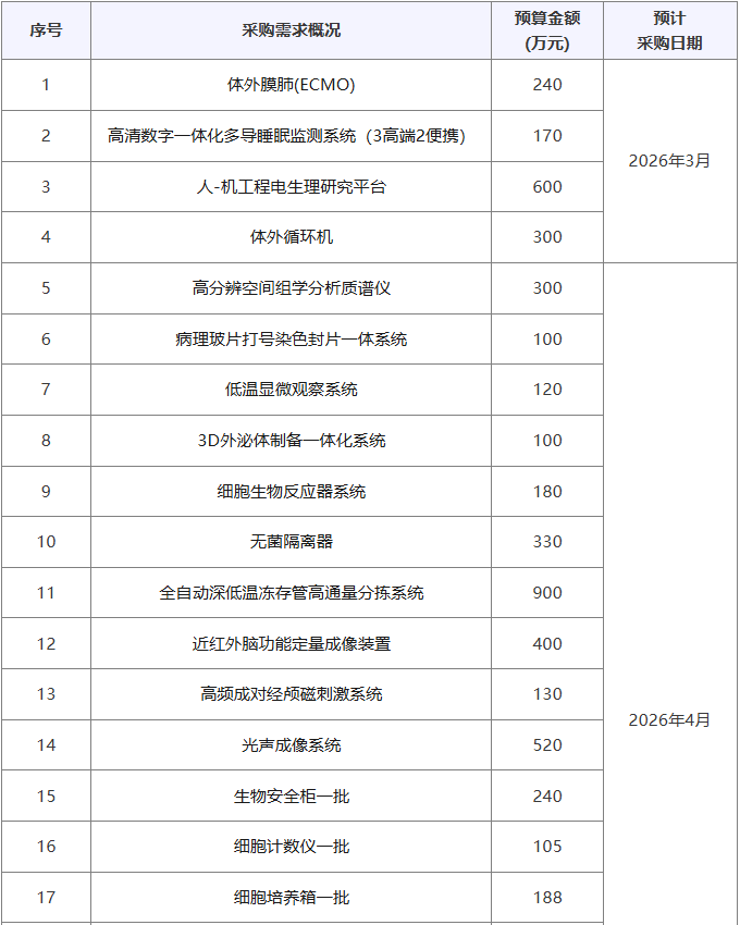 近期,上海臨床研究中心發(fā)布多項儀器采購意向,計劃采購高分辨空間組學(xué)分析質(zhì)譜儀、低溫顯微觀察系統(tǒng)、細(xì)胞生物反應(yīng)器系統(tǒng)、生物安全柜、細(xì)胞計數(shù)儀、二氧化碳細(xì)胞培養(yǎng)搖床、倒置熒光顯微鏡、超低溫冰箱等儀器設(shè)備,預(yù)算總金額15513.1萬元。預(yù)計采購時間20263~5月。