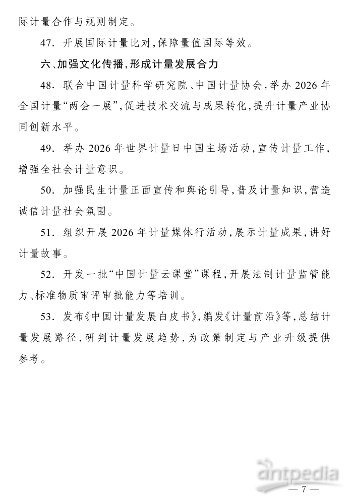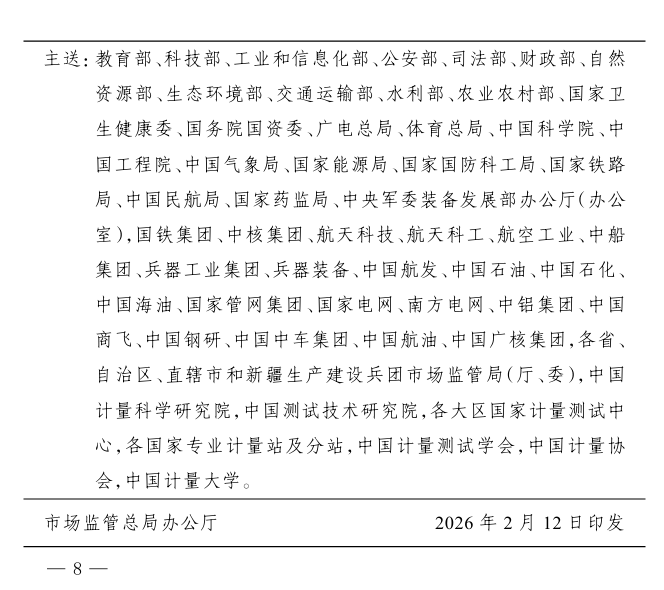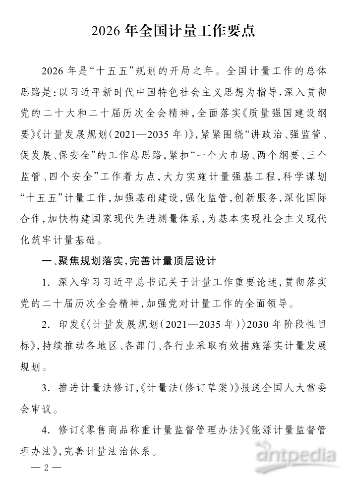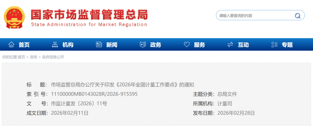 近日,市場(chǎng)監(jiān)管總局印發(fā)《2026年全國(guó)計(jì)量工作要點(diǎn)》,明確2026年將緊緊圍繞“講政治、強(qiáng)監(jiān)管、促發(fā)展、保安全”的工作總思路,緊扣“一個(gè)大市場(chǎng)、兩個(gè)綱要、三個(gè)監(jiān)管、四個(gè)安全”工作著力點(diǎn),大力實(shí)施計(jì)量強(qiáng)基工程,科學(xué)謀劃“十五五”計(jì)量工作,加強(qiáng)基礎(chǔ)建設(shè),強(qiáng)化監(jiān)管,創(chuàng)新服務(wù),深化國(guó)際合作,加快構(gòu)建國(guó)家現(xiàn)代先進(jìn)測(cè)量體系,為基本實(shí)現(xiàn)社會(huì)主義現(xiàn)代化筑牢計(jì)量基礎(chǔ)。